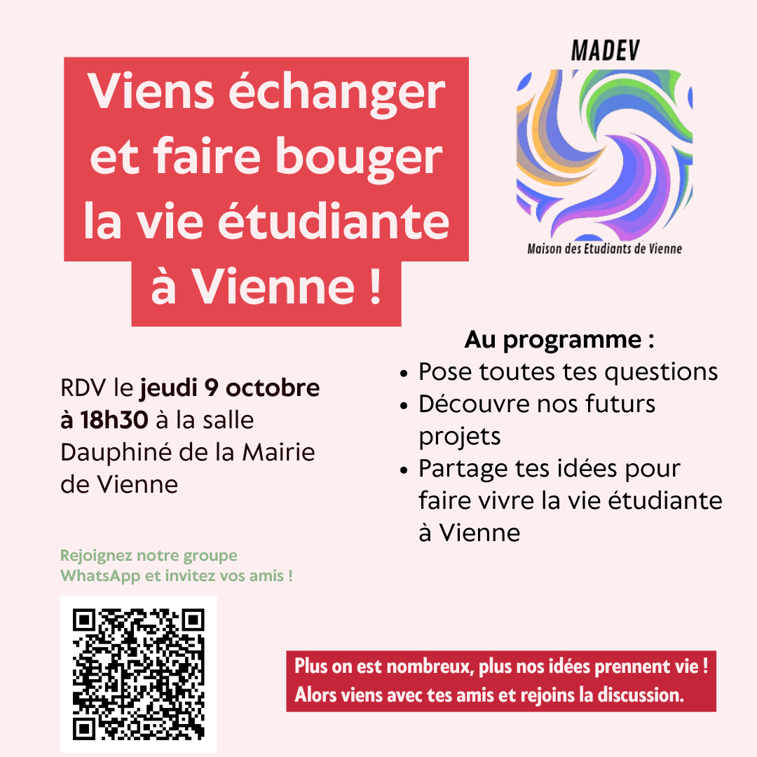 Cet événement a pour but de permettre aux jeunes de poser leurs questions, découvrir nos projets et partager leurs idées pour faire vivre la vie étudiante à Vienne
